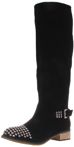 Need a loyal boot all season long? Grab the Rover for every outfit choice. Kelsi Dagger showcases a black suede upper covering 17 inch shaft and silver studded vamp. A low slung buckle and 1 1/2 inch block heel finishes this stunning look.
